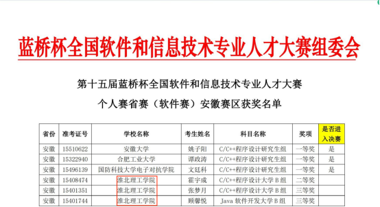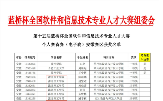 近日,第十五届蓝桥杯全国软件和信息技术专业人才大赛个人赛省赛安徽赛区圆满落幕。必赢76net线路官网必赢76net线路官网首次组织并筛选出17位学子参赛。其中4位参加软件赛的学子荣获省级大学B组二等奖1项和省级大学B组三等奖2项,13位参加电子赛的学子荣获省级大学生组二等奖1项和省级大学组三等奖5项。部分获奖名单如图所示: