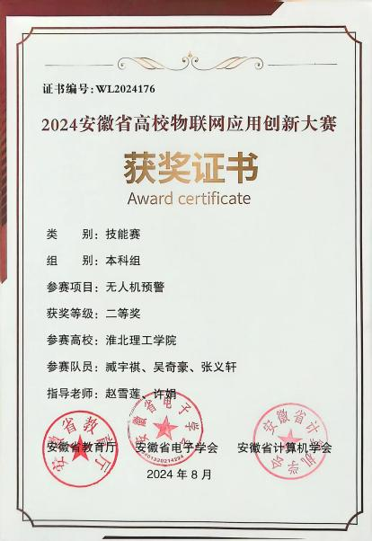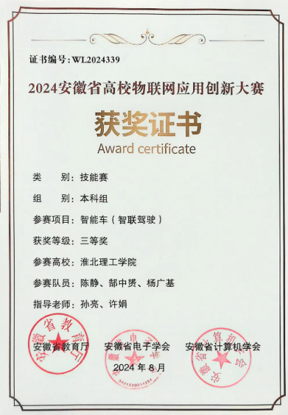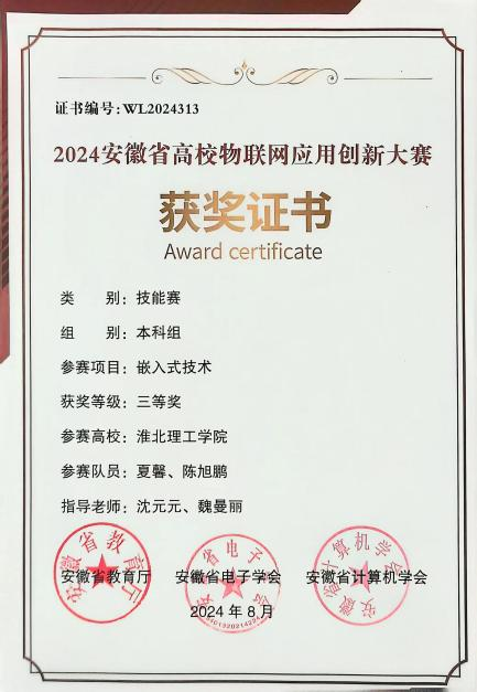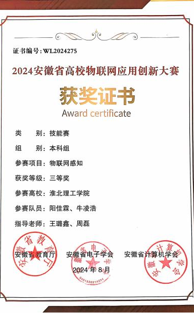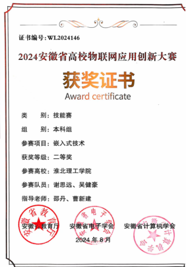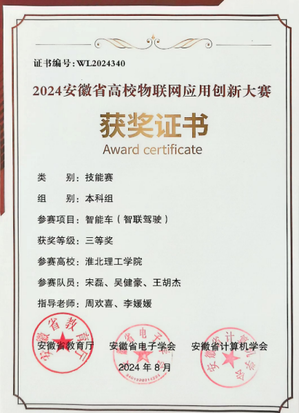 2024年5月11日至18日,我院曹新建、王璐鑫和李硕儒等作为指导老师带领夏馨、陈旭鹏、阳佳霖、孙亚楠等学生参加安徽省高校物联网应用创新大赛,大赛由安徽省教育厅主办、安徽大学和安徽省计算机学会、安徽省电子学会承办,整个比赛过程充分展现了必赢76net线路官网学子较扎实的理论功底、实操能力和良好精神风貌。