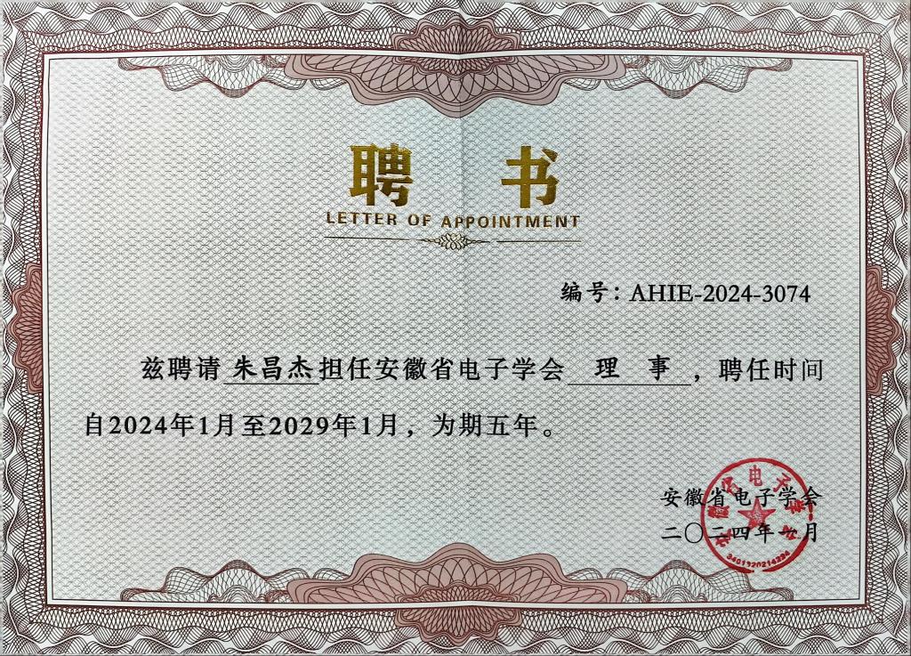 我院朱昌杰教授继受聘安徽省计算机学会(ACF)常务理事以来,又受聘安徽省电子学会理事。