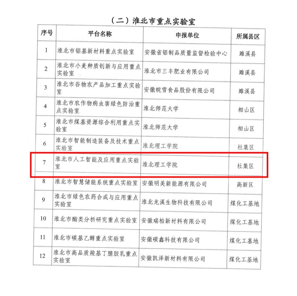 为进一步贯彻落实《关于加快推进科技创新平台建设的实施意见》(淮政办〔2023〕16号)精神,根据《关于印发<淮北市科技创新平台认定管理办法(试行)>和<淮北市科技创新平台绩效评价管理办法(试行)>的通知》(淮科〔2023〕16号)和《关于申报2024年度淮北市科技创新平台的通知》(淮科秘〔2024〕28号)文件精神,淮北市科技局经通知发布、组织申报、县区(园区)科技管理部门审核推荐、复核、专家评审、局党组会议研究同意、公示等程序,必赢76net线路官网必赢76net线路官网申报的“淮北市人工智能及应用重点实验室”,获批立项建设。