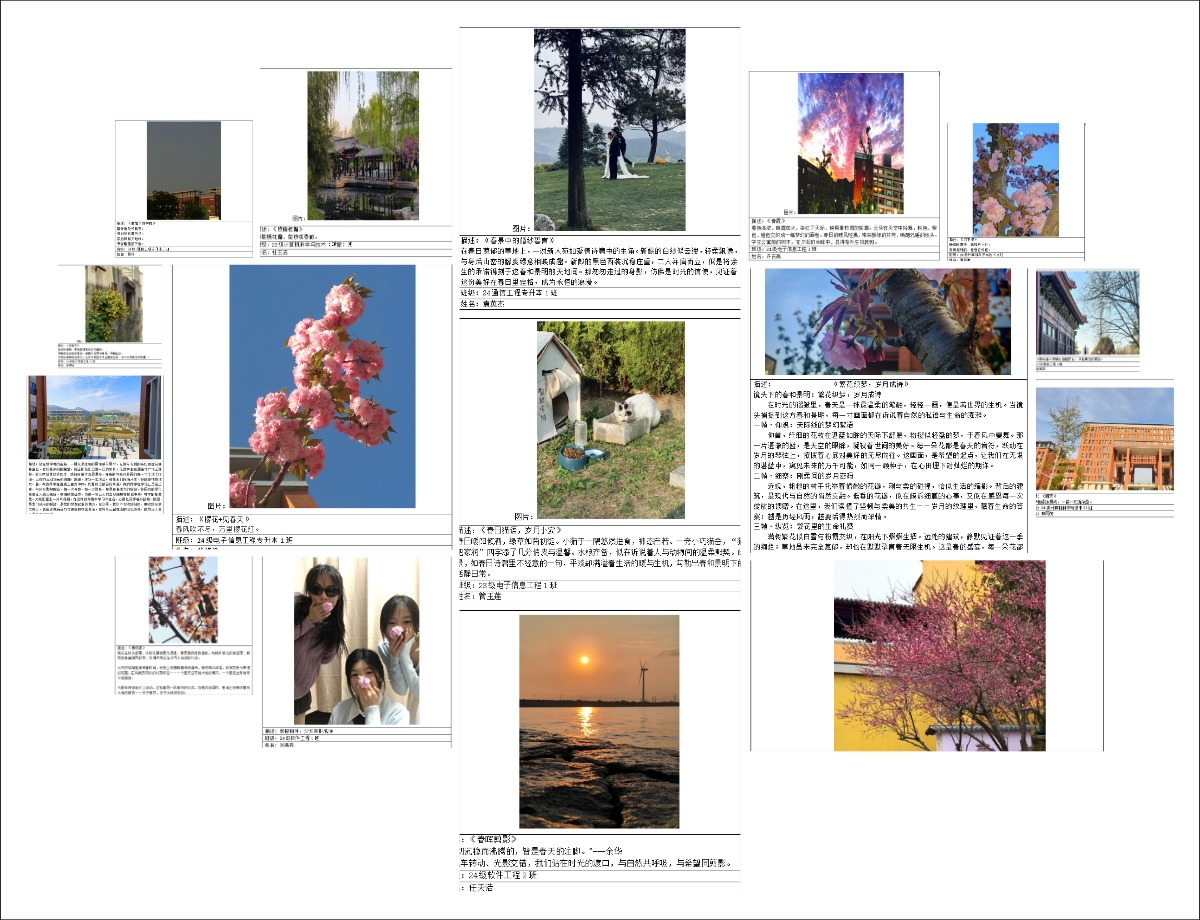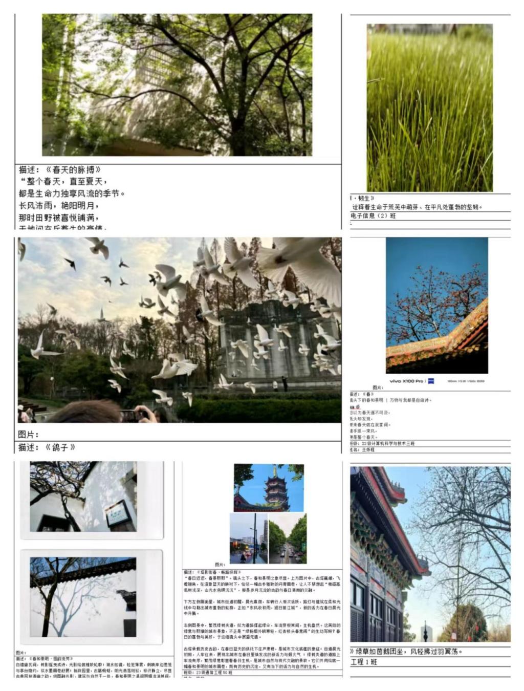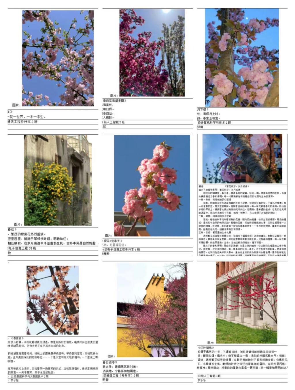 在为期10天的活动时间里,参赛者们手持相机,穿梭于校园内外、城市角落,用镜头捕捉春日里繁花盛开、草木葱茏、阳光洒落的每一个精彩瞬间。同时,以灵动的文字,或创作诗歌,或引用名人佳句,为摄影作品赋予深刻的情感与内涵,让画面与文字相互呼应。