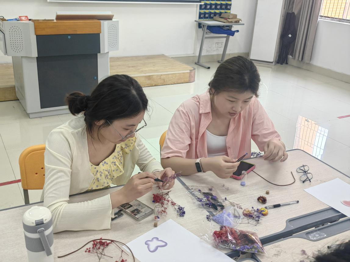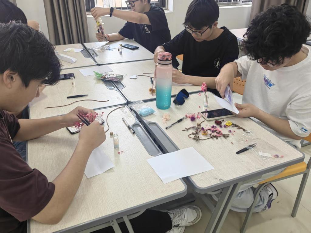 创作过程中,同学们充分展现了他们的创意与想象力,将五彩缤纷的碎石装入玻璃瓶内。一些同学采用渐变色的搭配技巧,使得瓶内展现出彩虹般的斑斓层次;而另一些同学则巧妙地将精致的花瓣装饰品融入其中,为能量瓶赋予了独特的象征意义。众人在创作的同时,亦与周围的同学分享心得,现场氛围轻松愉快,不时传来阵阵欢声笑语。