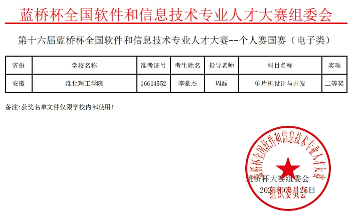本次大赛共有来自全国2000余所高校的顶尖选手争夺“蓝桥杯”全国总决赛桂冠。我院4名学生进入全国总决赛,经过4个小时的激烈角逐,在C/C++程序设计组霍宇成同学获国家一等奖1项、尹洪超同学获国家三等奖,在java软件开发组韩筱雅同学获国家三等奖;在单片机设计与开发组李豪杰同学获国家二等奖。学院学子以突出的技术应用能力脱颖而出,参加全国总决赛学生全部获奖,充分展现学院在信息技术领域的育人成果。