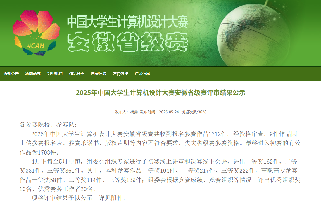 必赢官网必赢76net线路官网学子在2025年中国大学生计算机设计大赛安徽省级赛中表现亮眼,凭借扎实的专业功底与创新实践能力,斩获多项荣誉。本次大赛中,我院学生共获得一等奖3项、二等奖3项、三等奖1项。取得了获一等奖数在全省参赛的43所本科高校并列第9名好成绩。其中4项作品被推荐参加在7月和8月份举行的全国总决赛。