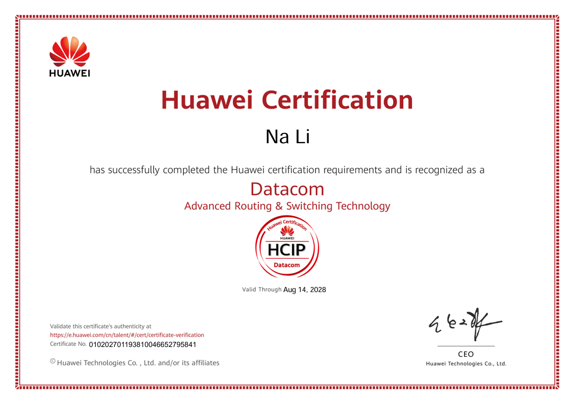 在本次认证考核中,学生团队表现优异,共有14人通过认证,其中包括13人获得HCIA-数通方向(华为认证ICT工程师)认证,1人获得HCIP(华为认证ICT高级工程师)认证。一名获得HCIP认证的学生表示:“产业学院的项目化课程和真实业务环境,让我对网络技术有了系统掌握,职业发展方向更加明确。”