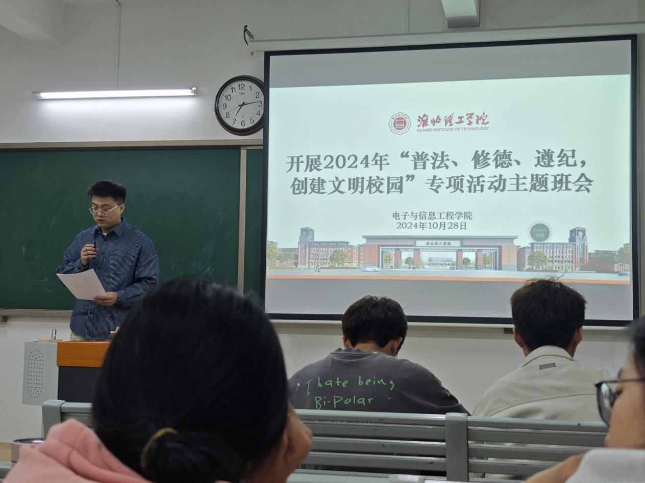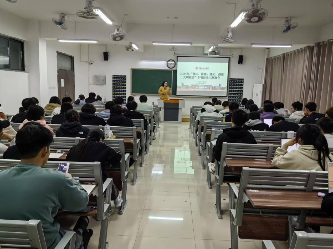 为贯彻落实立德树人的根本任务,坚持“依法治校,以德治校”。必赢76net线路官网于2024年10月28日开展“普法、修德、遵纪,创建文明校园”的主题班会。此次主题班会旨在通过丰富多彩的宣传教育和实践活动,营造出一个法治、文明、和谐的校园环境。