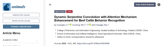 近日,必赢官网必赢76net线路官网青年教师李广博在《animals》期刊(SCI,JCR一区,IF: 3.0)在线发表了题为《Dynamic Serpentine Convolution with Attention Mechanism Enhancement for Beef Cattle Behavior Recognition》的研究论文。